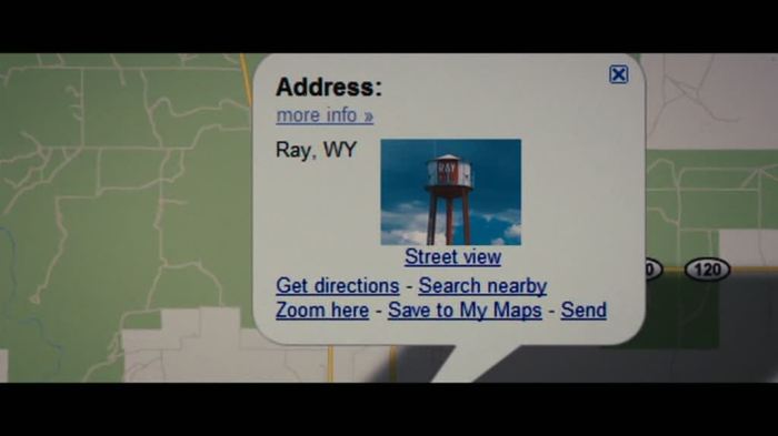 Un détail amusant : dans le film a été ajouté au-dessus de la carte Google une fenêtre Street view présentant une photographie du Château d’Eau de Roy, modifié en Ray comme dans le film. Or le service Street view est pour l’instant réservé aux zones urbaines qu’aiment les Morgan et n’est pas disponible en réalité à Ray, Wyoming, pas plus qu’à Roy, NM.