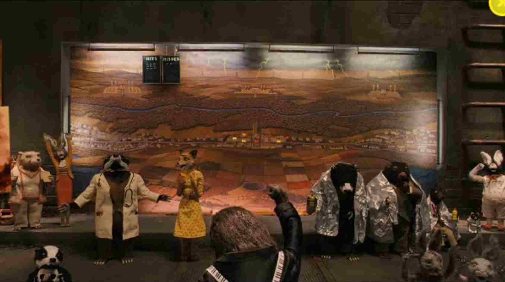 Fantastic Mr Fox, superbe film d’animation de Wes Anderson, intègre plusieurs dispositifs spatiaux, pour la plupart de type plan de bataille ou plan d’action. L’un d’entre eux prend d’ailleurs la forme d’une carte animée. Le plus original de ces dispositifs est certainement le tableau peint par Felicity Fox pour accompagner l’action menée par les « animaux sauvages » contre les infâmes fermiers. Elle y marque les faits d’arme, les bâtiments dynamités, etc.. Le tableau est de facture réaliste en ce sens qu’il représente fidèlement le monde fantaisiste et les perspectives improbables du film. Mais il évoque aussi les tableaux présentant les vues générales de cités de l’époque classique, que l’on trouve dans les musées. C’est un exemple de mise en abymes réussie et une illustration de la virtuosité plastique du film. La réalité du monde imaginaire de Wes Anderson est renforcée par sa représentation à l’intérieur même du film.
