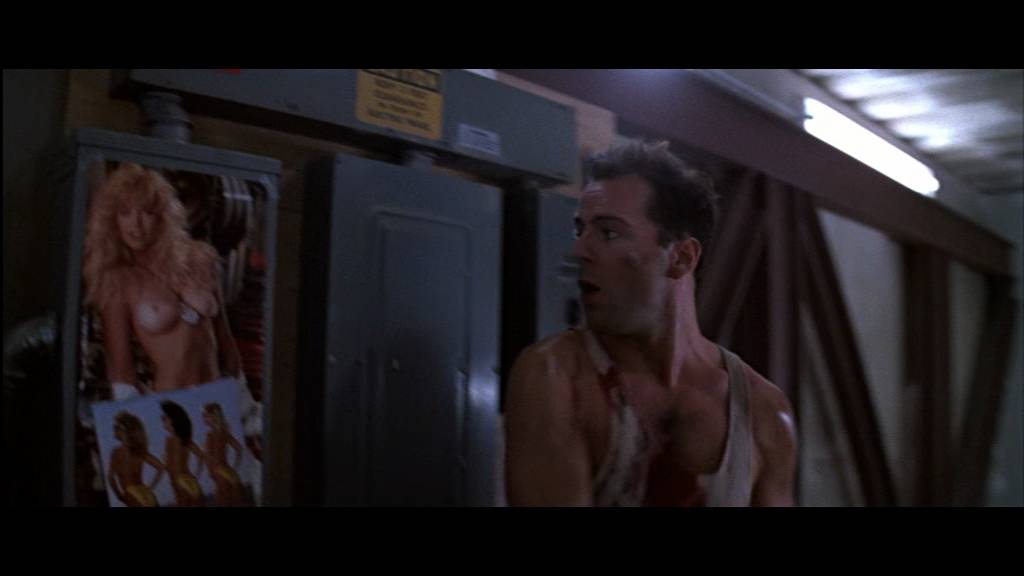 Ce poster semble se situe sous le toit, au dernier étage (35ième étage qui semble être un double étage technique). McClane passe deux fois à côté (et salue même la demoiselle la seconde fois) à la 40ème minute et à la 45ème minute… Sachant qu’entre les deux, il y a une longue fusillade sur le toit et fuite de McClane dans des conduits d’aération.