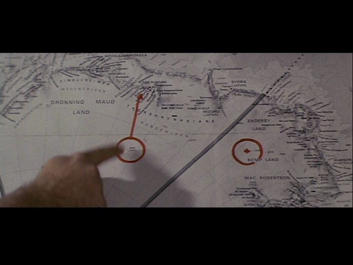 - une seconde, ronde également, marquée d’une croix en son centre. Elle pourrait correspondre au campement américain (situé à une heure d’hélicoptère du camp norvégien. La distance (80km) est donnée dans une scène présente dans les bonus).