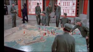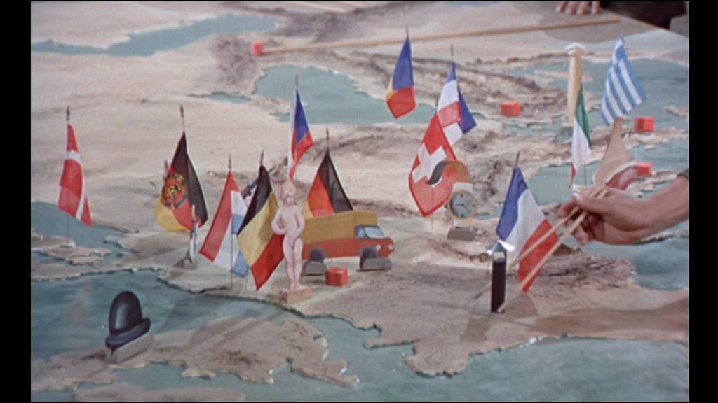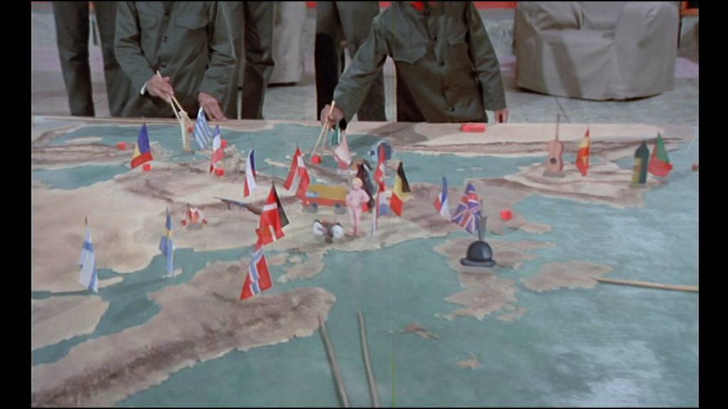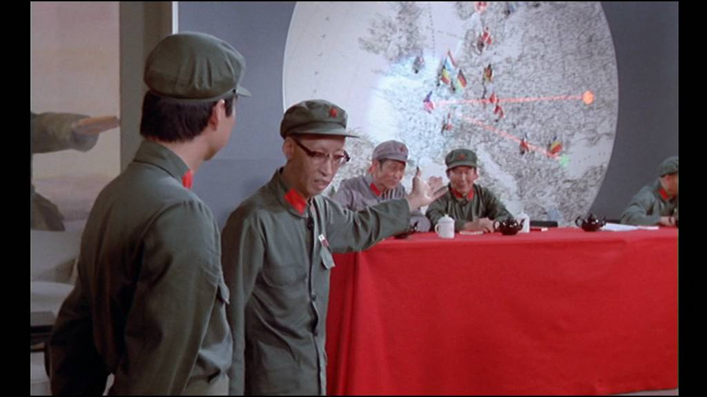 En 1974, Jean Yanne revisite la période de l’occupation dans cette comédie où l’armée chinoise envahit l’Europe. Depuis Pékin, le « Comité Central Révolutionnaire » met en place sa stratégie. Dans ses locaux, on aperçoit deux types de cartes.