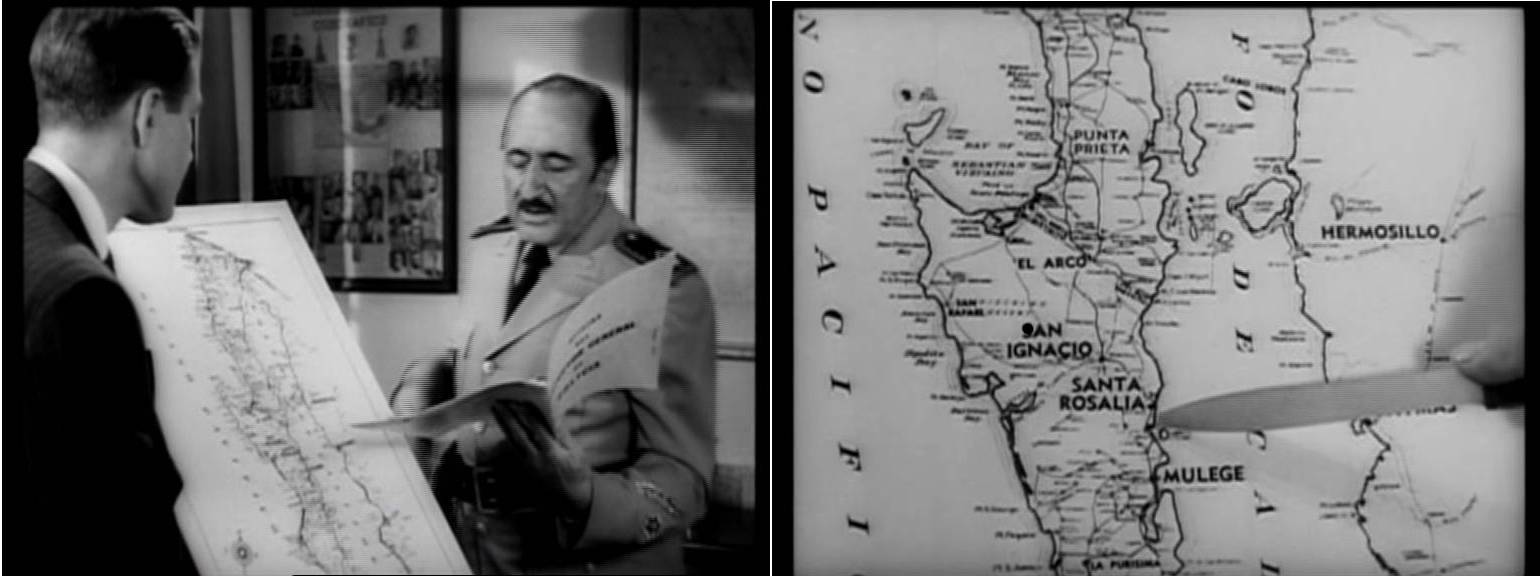 The police also uses maps for anticipating the route of the fugitive. During a meeting between two police officers, an American and a Mexican, the Mexican infers the fugitive destination and illustrates his demonstration on a map. In the office, we can see a wall map of the United Mexican States, which is not used by the policemen (34th minute).