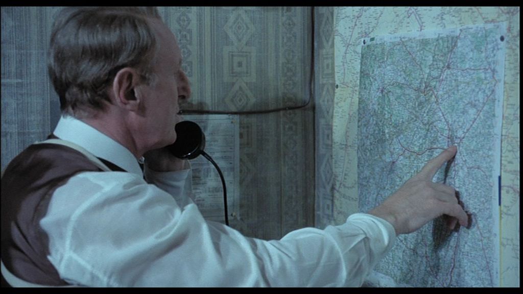 After the Vogel’s escape, Mattei phones to the police station to obtain reinforcements (14th minute). He asks specifically to the level-crossing keeper a Michelin road map and the exact location of the level-crossing. We learn that the action takes place in Meursault-l’Hôpital, on the D23 road. We can locate exactly this place (46°57’59.30″N, 4°47’34.94″E). Mattei organizes the hunt and uses the map to delimit the search zone. He asks roadblocks on all the roads between Arnay-le-Duc, Nuits-Saint-Georges, Beaune, Chalon-sur-Saône, Le Creusot and Autun. He points successively all this towns on the map while he enumerates them.
