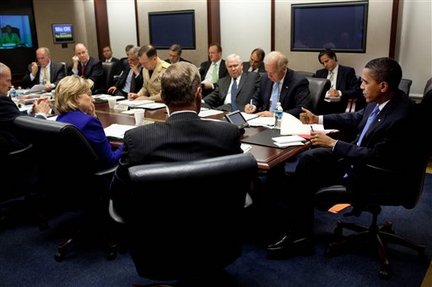 In this photo released by the White House, President Barack Obama holds a review on Afghanistan in the Situation Room of the White House, Wednesday, Sept. 30, 2009, in Washington. (AP Photo/The White House, Pete Souza)