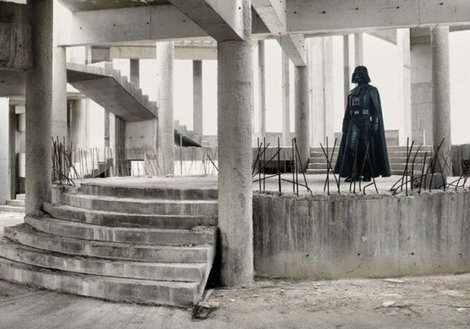The dark lens series of the photographer Cédric Delseau (a book at Editions Xavier Barral) is an artistic kind of materialization of fiction. The photographer takes pictures in contemporary urban sites of different countries (France, Dubai …) and add them characters and spaceships from the movie Star Warsby George Lukas. This is not just a collage of digital images. Delseau shoots action figures, models or toys by respecting size, perspective and light and combine this new pictures with the photos of the locations. In the last series in Dubai, he also uses costumed actors. By populating photographs of real places with real figures issued from fiction he breaches with the convention : can places that welcome so easily the futuristic creatures of Star Wars can be real ? These welle known creatures that seem so comfortable in these places are they really imaginary? A beautiful thought on the way reality is built through fiction.