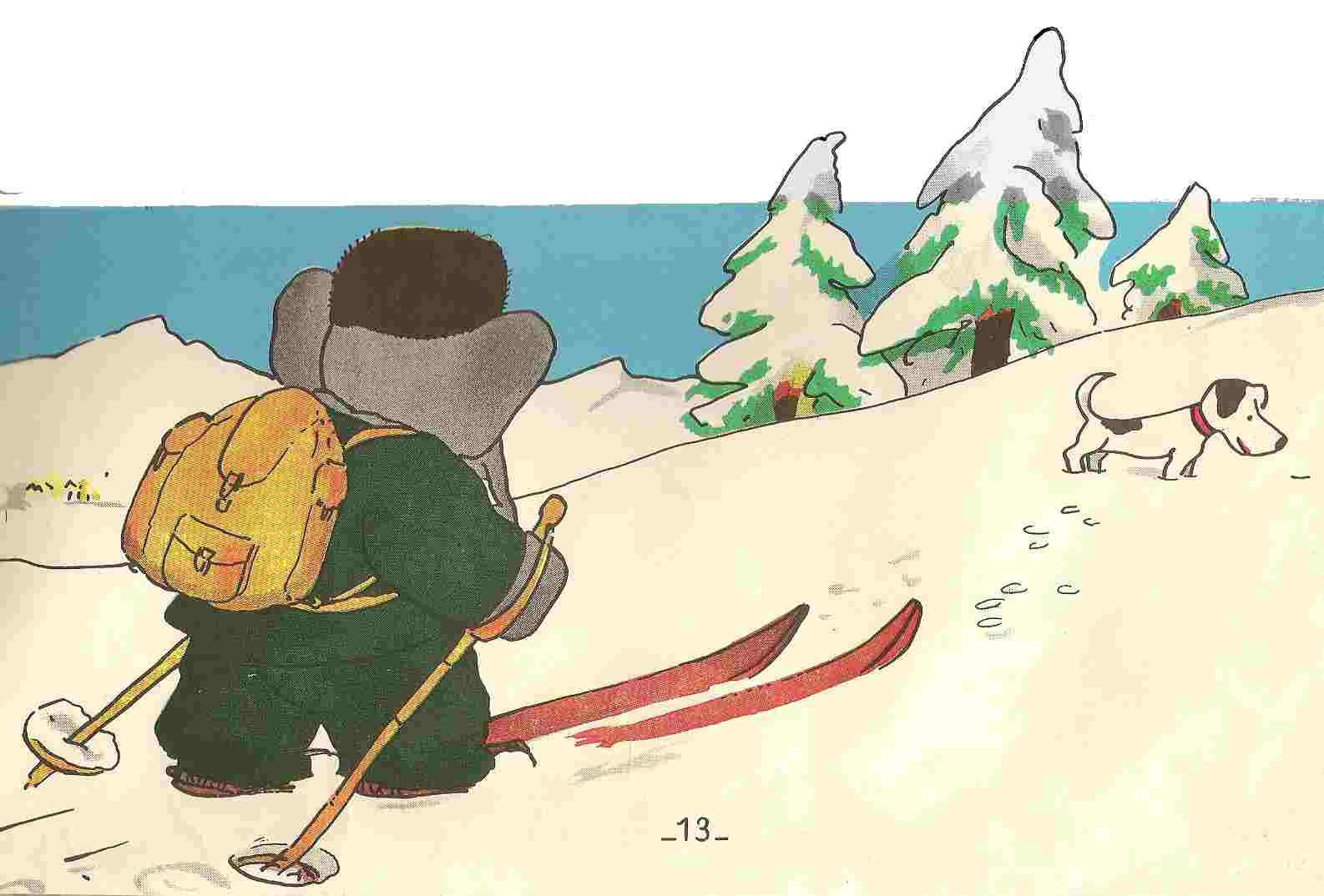 Let’s sum up the story. Babar is looking for Father Christmas with the aim of asking him to add the Elephant’s Country to his toys delivery program. He arrives in PRJMNESTWE in Bohemia and decides to ski to the mountain where Father Christmas is supposed to live. The dwarves of the mountain bombard his dog Duck with snowballs. When trying to follow them he is caught in a violent storm that forced him to stop. He digs a shelter in the snow and makes a roof with poles and skis. But suddenly the ground caves in under his feet and he falls into Father Christmas’s cavern through an air vent. The dwarfs warm him up and look after him. Father Christmas invites him to share a soup before he invites him to visit his house. The rest of the story has to be read in the album.