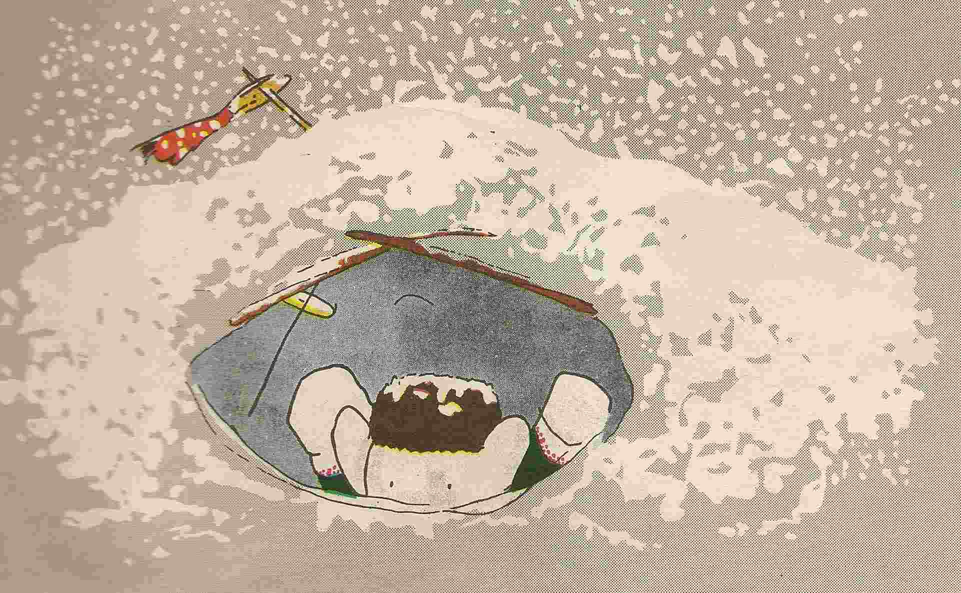 La séquence témoigne aussi d’une grande maîtrise graphique en parfaite correspondance avec le récit. Les vignettes du parcours de Babar dans la neige ne sont pas précisément délimitées et débordent sur la page. Cet effet s’exacerbe dans la tempête. Les vignettes envahies par la neige qui vole s’arrondissent et se perdent dans une brume grise indistincte qui couvre les deux pages. Dès que Babar se trouve dans l’univers organisé de la maison, les vignettes retrouvent leur régularité géométrique et leurs limites nettes. Du point de vue graphique, chacune des pièces de la maison renvoie alors à une vignette possible de l’histoire, comme les cases d’une bande dessinée.