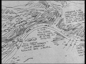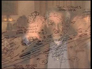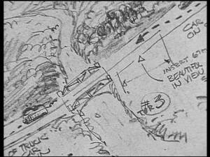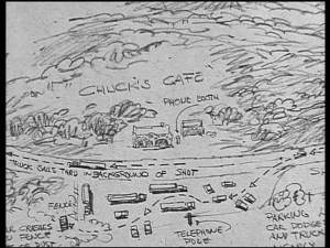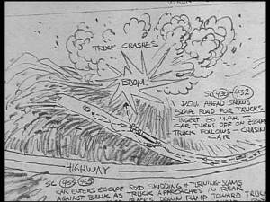 In the captivating documentary shot in 2001 by Laurent Bouzereau Duel, Conversation with Stephen Spielberg, found on the French DVD, Spielberg gives a lot of information about how he shot his film in 13 days and mainly outdoors. To shoot in such a short time a film with such a complicated logistics, Spielberg had a huge overview made, a kind of perspective map he used to plan the scenes and place the cameras. All events « on the road to the narrative » were placed on a giant mural covering the four walls of the motel room of the director. To organize the shooting, Spielberg « needed an overhanging view. » He did not use storyboards at this time but this overview allowed him to always know where he was and what he was filming.