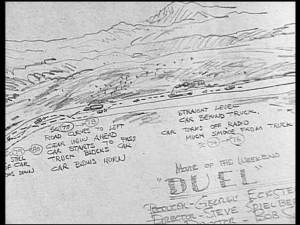 Dans le documentaire passionnant tourné par Laurent Bouzereau en 2001 Duel, Conversation avec Stephen Spielberg, qui se trouve sur le DVD français, Spielberg donne un grand nombre d’information sur la manière dont il a tourné son film en 13 jours et principalement en extérieur. Pour tourner en si peu de temps un film à la logistique compliquée, Spielberg avait fait dresser une gigantesque représentation des plans de son film, une sorte de carte en perspective qui lui servait à planifier les scènes et placer les caméras. Tous les événements « sur la route du récit » (« on the road of the narrative ») ont été placés sur cette gigantesque fresque qui couvrait les 4 murs de la chambre du motel du réalisateur lors du tournage. Pour organiser les prises de vue, celui-ci « avait besoin d’une vue surplombante ». Il n’utilisait pas à l’époque de storyboard mais cette vue d’ensemble lui a permis de toujours savoir où il se trouvait et ce qu’il devait filmer.