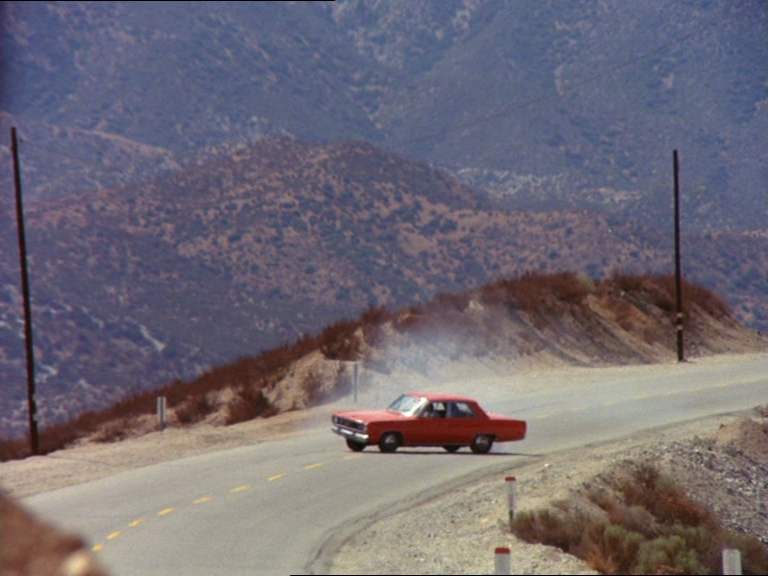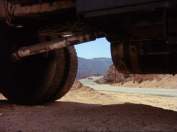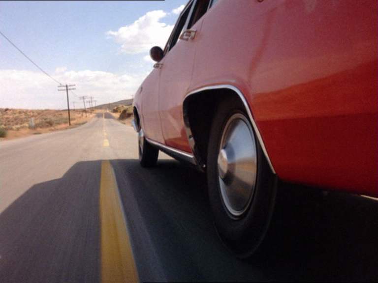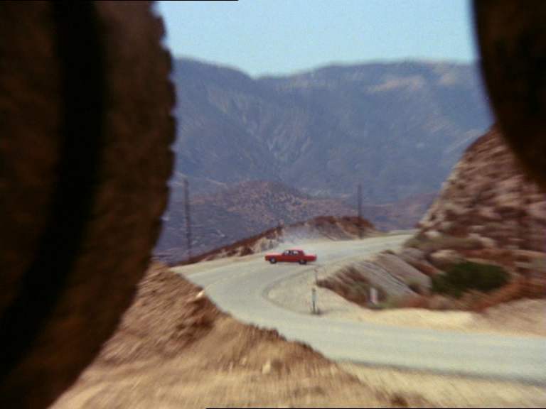 Ci-dessous un exemple de fantastique zoom arrière qui résume le point de vue spatial du film : à partir du cadrage habituel d’une voiture sur une route le plan dévoile progressivement les essieux du camion qui l’enferment comme dans un piège.