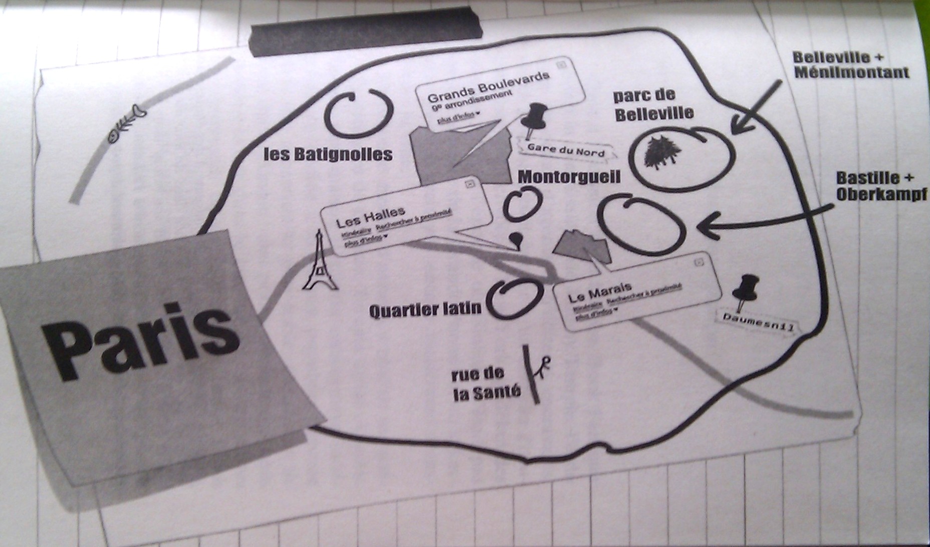 A l’instar des adaptations de Nestor Burma en bandes dessinées par Jacques Tardi (voir par exemple Brouillard sur le pont de Tolbiac) où une carte présente les différents lieux de l’histoire, ce recueil de nouvelles noires débute par une carte schématique de Paris. Les lieux des différentes nouvelles y sont localisées.