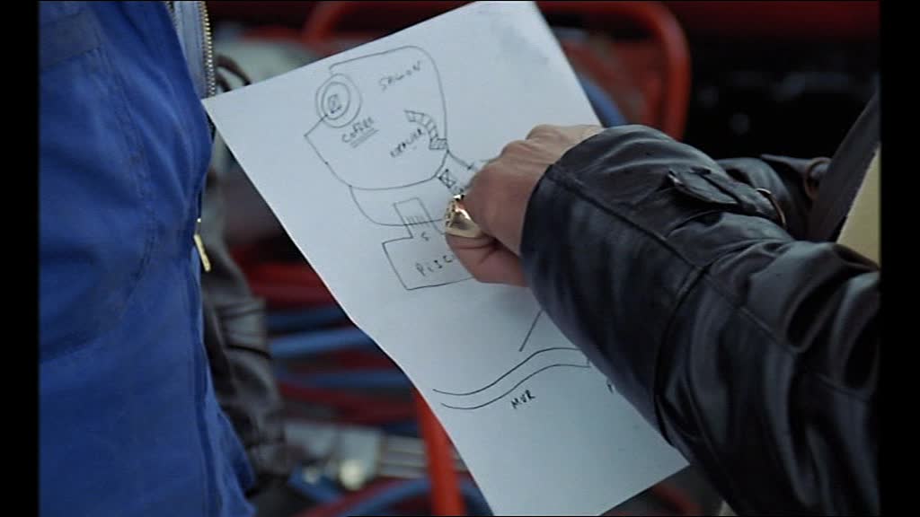 Ce n’est que le lendemain matin que René comprend, depuis sa planque, qu’il s’est fait berné, quand il apprend à la radio l’attaque du commissariat… Et c’est à ce moment qu’il met en place un dispositif spatial très original, s’apparentant à une maquette dont le support est une table de cuisine et dont les éléments constitutifs sont des objets indissociables de l’heure du café (52ème minute). En effet, la villa est figurée par une tasse à café retournée sur sa coupelle, le coffre par une boite d’allumette, René et des complices par des mégots, l’hôtel de police par un sucrier (et les policiers par les sucres) et enfin, les traîtres par un briquet. René refait alors le scénario du drame qui s’est joué la veille à la villa.