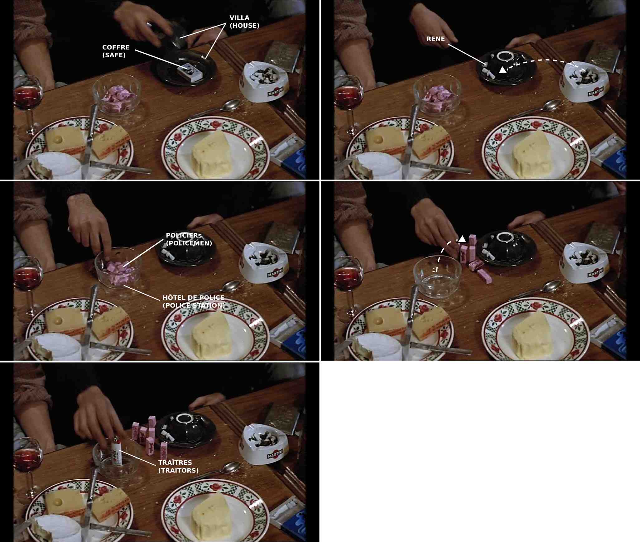 On the next morning René understands in his hideout that he has been fooled when he hears a news on the radio about the police station attack. And he sets up on the kitchen table a very original spatial machinery, similar to a model . He uses different objects that are on this table (52nd minute). A coffee cup turned on its small dish represents the villa, a matchbox is the safe, some butts are René and accomplices, a sugar bowl is the police station (and sugars are policemen) and finally, a lighter represents traitors. Using this machinrey, René replays the drama of the day before.