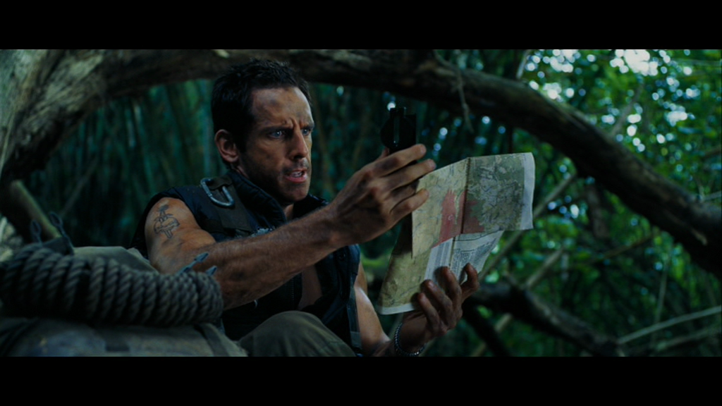 Souvent au cinéma, lorsque les protagonistes se retrouvent à devoir utiliser une carte, ils y arrivent sans problème, comme si cette connaissance allait de soi. Mais ce constat n’est pas systématiquement vérifié comme par exemple dans Le Voyage de la peur. Dans Tonnerre sous les tropiques non plus. L’un des rouages de l’intrigue est justement que l’acteur Tugg Speedman (Ben Stiller), a qui a été confiée la carte, est incapable de s’orienter avec cette dernière. Il n’arrive pas à la déchiffrer et amène ses camarades sur la mauvaise route. L’un d’eux, Kirk Lazarus (Robert Downey Jr.), lui fait bien remarquer qu’il y a des lettres et des chiffres qui lui permettent d’orienter la carte pour une meilleur lecture, que l’utilisation d’une carte nécessite une certain pratique que Kevin Sandusky (Jay Baruchel), l’un d’eux, a fort heureusement acquise. Mais Speedman refuse de l’admettre, et de céder la carte. Cette dernière est ici symbole de pouvoir… Pour les militaires, donné par le grade… Pour les acteurs, donné par le réalisateur… (31ième, 45ième, 47ième, 50ième, 52ième minutes)