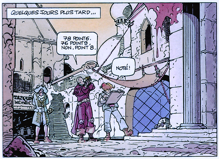 Joli billet pour une BD plutôt fantaisiste. Je m’interroge sur l’intérêt d’un sextant pour faire des levés topographiques en milieu urbain ;-).