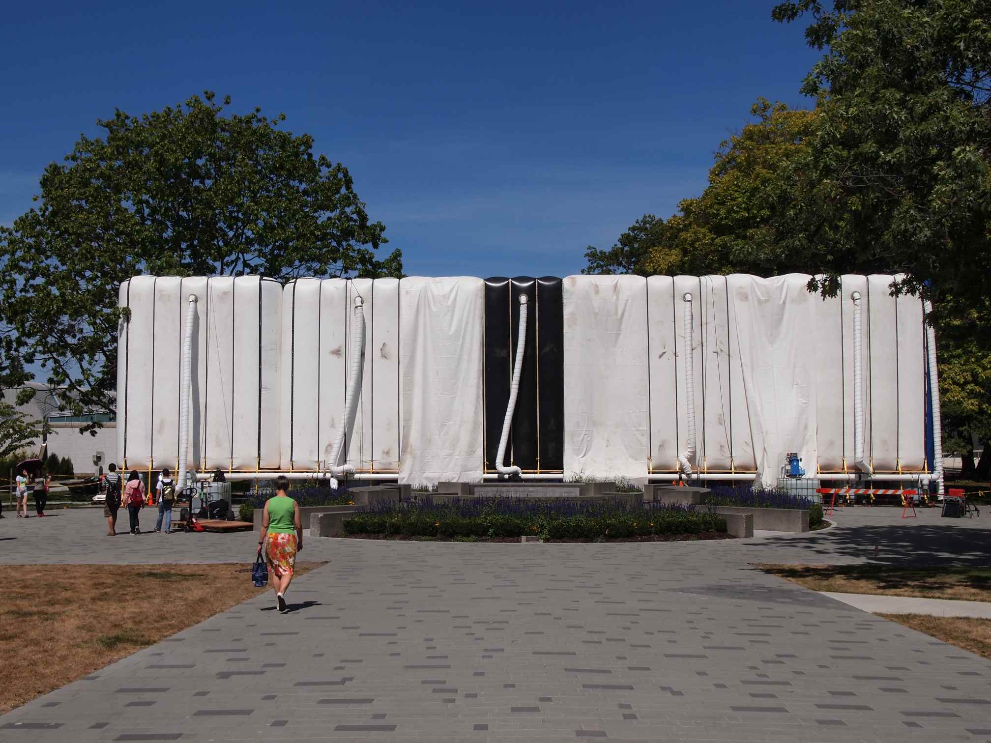 When you arrive on the main hall of the Campus, cameras and cranes make you quickly understand that a movie is going to be shot on the place. It is actually the implementation of the decor and the first rehearsal. The actors are not there yet. But it is not immediately obvious that what you have in front of your eyes is actually a movie setting. You need to have seen the « natural » scene in Google Street View to understand that all elements (flowerbeds, flags …) are brought in purpose to evoke New-York’s Fair. The blue structure in the background is an inflate wall covered with a blue tarpaulin (seen from the back in the photo), probably dedicated to special effects.
