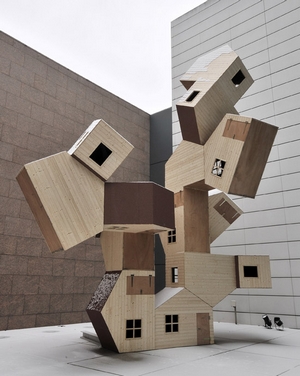 Oui, c’est vrai que dans mes élans utopiques, je cherche à constituer une nouvelle vision de la ville. Néanmoins, je regarde de loin les réflexions architecturales et urbanistiques très poussées. Mais certains projets m’interpellent. Ainsi, à Shanghai il y a le projet de construire une espèce de ville verticale : un gratte-ciel où pourraient vivre cent mille personnes, ce qui est assez fascinant. À Rotterdam aussi, de façon plus modeste, il existe les maisons cubes qui flottent au-dessus du sol sur leurs arêtes. Si la dimension utopique existe dans Village avec l’idée de révolutionner l’habitat communautaire, je pars quand même d’une réalité. En fait, dans mes œuvres, je ne cherche jamais à détruire l’existant, au contraire : ces maisons banales existent ; qu’est-ce que l’on peut en faire ? Comment s’accommoder du réel pour qu’il devienne plus poétique ? Finalement, je cherche plus à développer des « hétérotopies« , des « contre-espaces » comme disait Foucault[1].