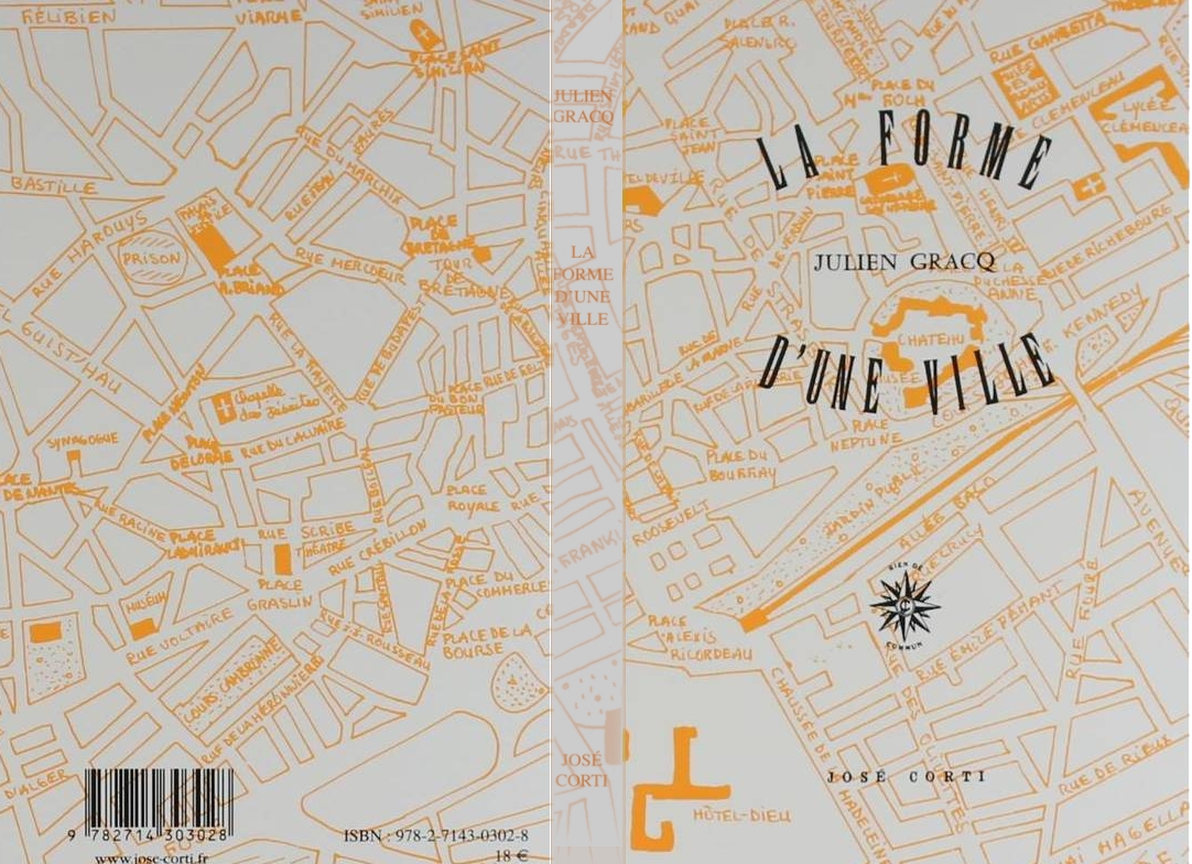 Plan du centre de Nantes : recto, verso et dos de la couverture du livre de Julien Gracq (copyright Editions José Corti, 1985)