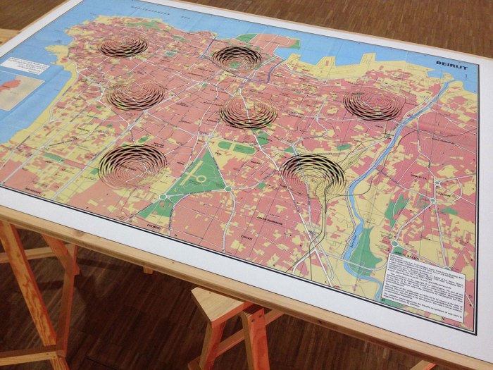 Enfin, on peut signaler « 3-D Cities », un triptyque de cartes des villes de Beyrouth, Bagdad et Kaboul, posées à plat sur des tables. Des cercles ont été délicatement découpés à la surface de ces cartes pour former des zones concaves ou convexes, évoquant des dômes ou des cratères. Ces structures en relief rendent ainsi visibles les séquelles de la guerre et l’empreinte qu’elle a laissé dans la mémoire des habitants. Elles rappellent aussi comment ces 3 ville subissent depuis plusieurs années un cycle permanent de destruction et de reconstruction, à la fois de manière positive et négative.