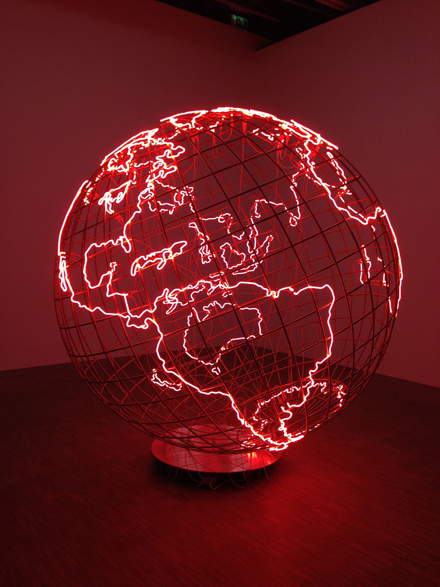 Son œuvre cartographique la plus impressionnante est un globe de 3 mètres de haut, couvert de néons rouges scintillants reprenant la forme des côtes continentales. Intitulé « Hot Spot », cette sculpture rappelle un peu l’habillage graphique d’un journal télévisé, et suggère l’idée d’un monde globalisé en conflit et soumis au réchauffement climatique.