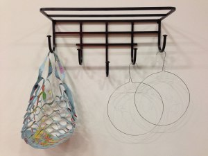 « Sans titre (étagère) » est une autre œuvre qui interroge le processus de projection cartographique et la manière dont il permet de jouer avec les forme et les distances (l’œuvre n’est malheureusement pas mentionnée dans la brochure de l’exposition). Deux objets sont suspendus à un porte-manteau sur un mur blanc. Le premier est une carte en couleur des pays du monde, finement découpée et remodelée sous la forme d’un sac à main. Le second est composé par deux cintres circulaires et leur ombre sur le mur, auxquelles s’ajoute le dessin des côtes continentales. Ces deux objets semblent très légers, presque en apesanteur.