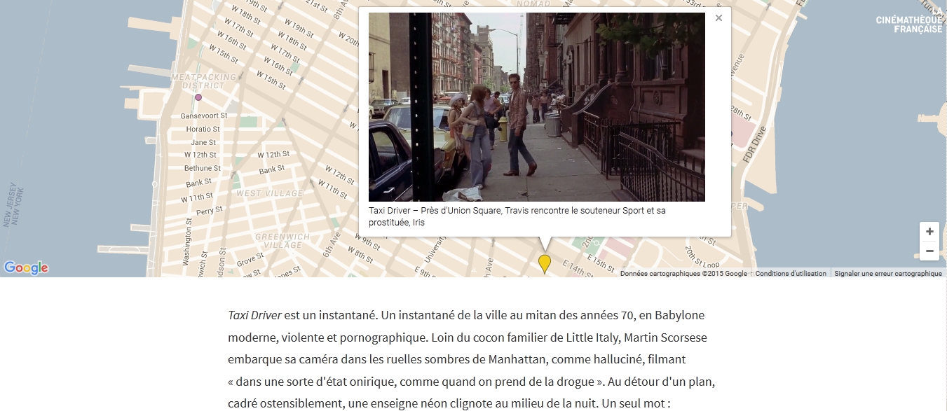 Pour chacun des films de Scorsese qui se déroule à New-York, les lieux de tournage sont géoréférencés sur un fond cartographique GoogleMaps.