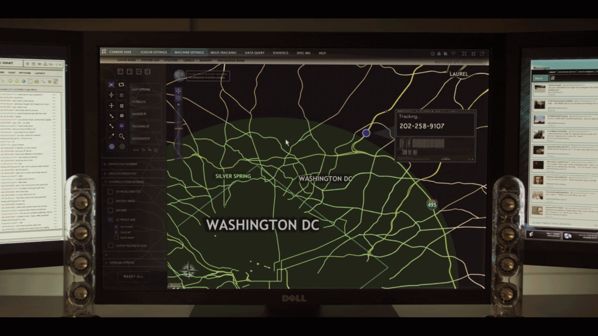 Un point clignotant sur l’écran de l’ordinateur indique que le personnage est tracé en permanence. Il est d’abord filmé frontalement, en alternance avec des plans montrant les personnages concernés (mais pas la cible). Puis après un gros plan sur un doigt frappant le clavier pour augmenter le son de l’ordinateur, la caméra a soudain pivoté et filme maintenant l’écran de manière rasante et rapprochée, loin de la projection zénithale cartographique.
