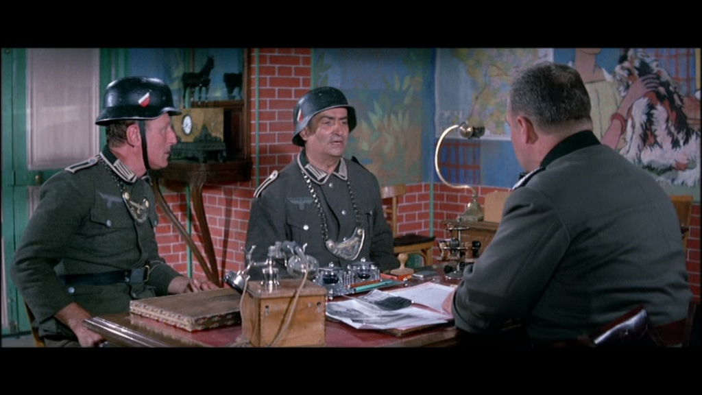 Two last maps are found in the Achbach’s office in Mersault’s Kommandantur. They just have an ornamental function. The first one is a map of France with the demarcation line. The second seems to correspond to the east-central region of France (we can clearly see the Geneva Lake). The maps appear at the 99th minute (during the interrogation of Cunningham) and at the 101th minute (during the interrogation of Augustin Bouvet and Stanislas Lefort (Louis de Funès)).