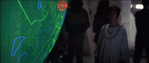Moreover, the most spectacular spatial device takes place in this control room. It’s a 3-dimensional model of the forest moon of Endor with the Death Star in orbit around it. In 2 minutes, we can observe 5 sequences during which Mon Mothma, the Alliance leader, and Admiral Ackbar, reveal the Emperor’s plans, but also explain the rebellion’s plan of attack to destroy the Death Star. So, we learn that Death Star have a geostationary orbit around the forest moon of Endor (47th and 48th minute) and it’s protected by a energy shield generated from the surface of the moon (48th minute). Finally, there is a simulation of the Death Star destruction (48th minute, 117th minute).
