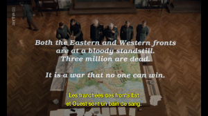 Puis on découvre les généraux allemands disserter sur la nécessité de faire disparaître rapidement le front de l’est. Pour appuyer la démonstration, un des personnages pousse avec une réglette les cubes représentant les troupes du front oriental.