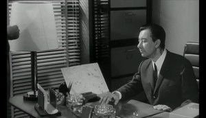 Entre 48 min. 51 sec. et 49 min. 06″ sec., le commissaire Blot, joué par Paul Meurisse, montre à son adjoint un plan de Paris, incliné sur son bureau. Mais comme on peut le voir sur la photo, ce plan n’est pas orienté avec le nord vers le haut mais vers son coin supérieur droit.