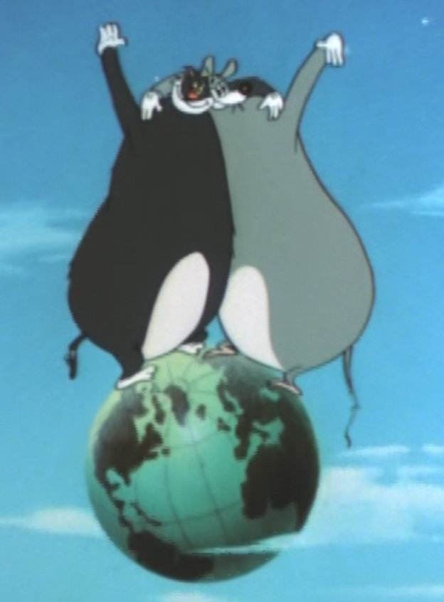 In his cartoon Kingsize Canary, Tex Avery depicts a battle between a cat, a mouse, a canary and a dog, who use a bottle of fast-acting plant fertilizer that makes them grow instantly to dominate their prey. By stealing the bottle from each other, the cat and mouse become bigger and bigger, until they reach and then exceed the size of the globe, which seems unable to support them. The two protagonists then turn to the viewer and say disappointedly:
