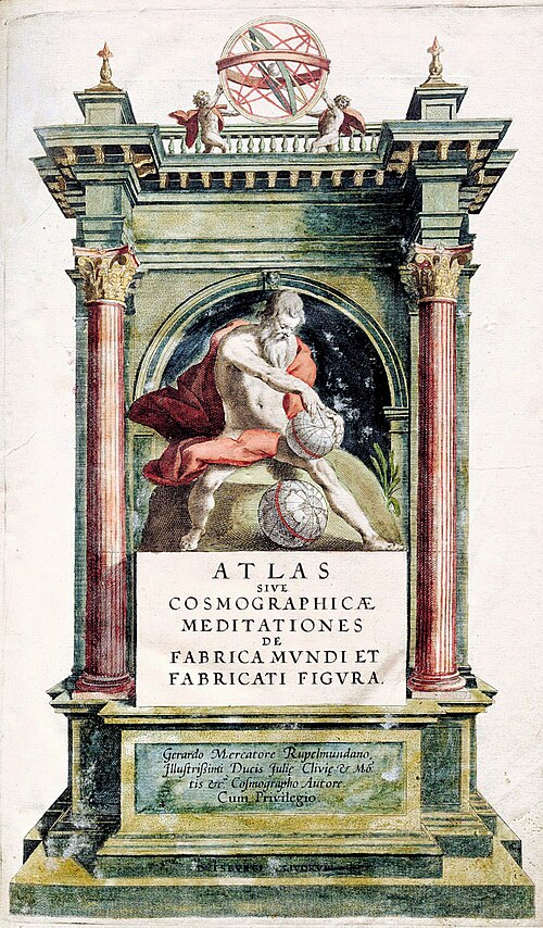 Atlas est une figure complexe de la mythologie grecque. Pour faire (très) court, Zeus exile le Titan déchu aux confins du monde grec, et le transforme en montagne, l’actuel massif du même nom qui va de l’Algérie au Maroc et culmine à plus de 4000 mètres. Les « Colonnes d’Atlas » avec lesquelles le Titan vaincu supporte la voûte céleste se trouvent au niveau du détroit de Gibraltar entre la Méditerranée et l’Atlantique. Atlas a la réputation d’initier les hommes aux mystères de la terre (géographie) et du ciel (astronomie). En frontispice de la collection de cartes devenue célèbre après sa mort, le grand cartographe Gert Mercator a représenté Atlas consultant un globe et le nom du Titan est devenu le nom usuel de ce type d’ouvrage.