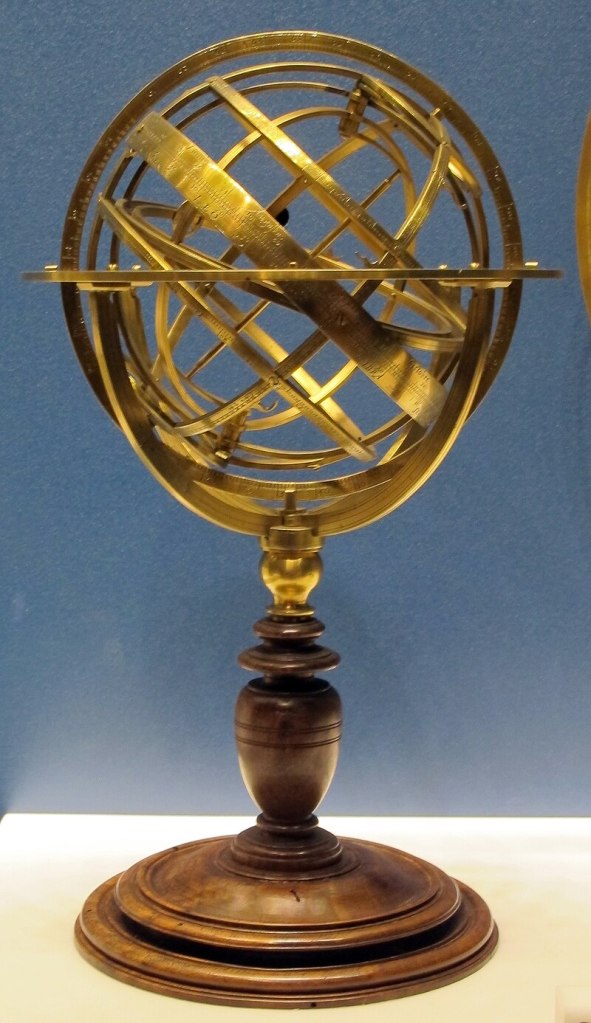 Ces lignes imaginaires correspondent aux anneaux des sphères armillaires, ces instruments fabriqués et utilisés dès l’Antiquité pour représenter et simuler le mouvement apparent du soleil et des planètes autour de la Terre, selon le modèle géocentrique établi par Ptolémée qui place la Terre au centre de l’univers avec les autres corps célestes tournant autour d’elle. Ce modèle sera dominant jusqu’à Copernic et son modèle héliocentrique.