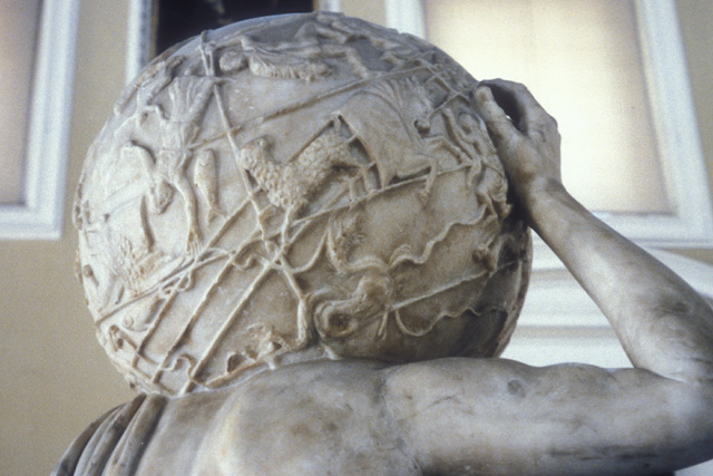 L’Atlas Farnese est une sculpture romaine du musée archéologique de Naples. Elle date du IIe siècle de l’ère chrétienne mais serait une copie d’une statue grecque beaucoup plus ancienne. La statue représente le Titan Atlas portant sur ses épaules non pas le globe terrestre mais la sphère céleste où s’inscrivent les figures du Zodiaque. Après sa victoire contre les Titans, Zeus a condamné Atlas à supporter pour l’éternité la voûte du ciel. Dans l’Antiquité, on pensait en effet que les étoiles étaient toutes situées à la même distance sur une sphère entourant la terre. Leur position servait aux voyageurs, en particulier les marins, pour se repérer pendant leurs déplacements.