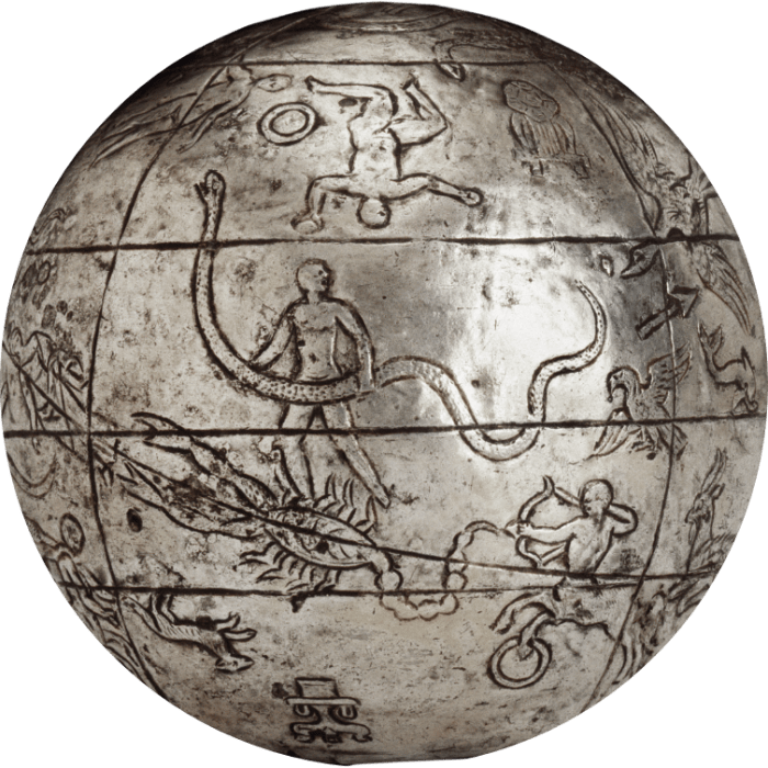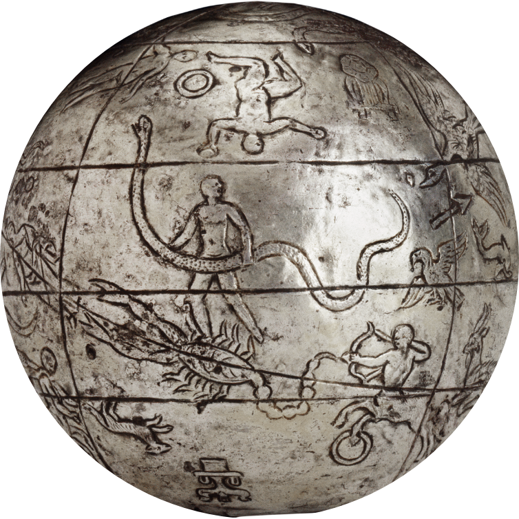 On parle souvent de l’Atlas Farnese comme de la plus ancienne représentation artistique en trois dimensions d’un globe qui nous soit parvenue. Pourtant, d’après l’exposition Le monde en sphères, en 2019 à la Bibliothèque Nationale de France, une petite sphère céleste en argent trouvée en Turquie serait plus ancienne de quatre siècles.