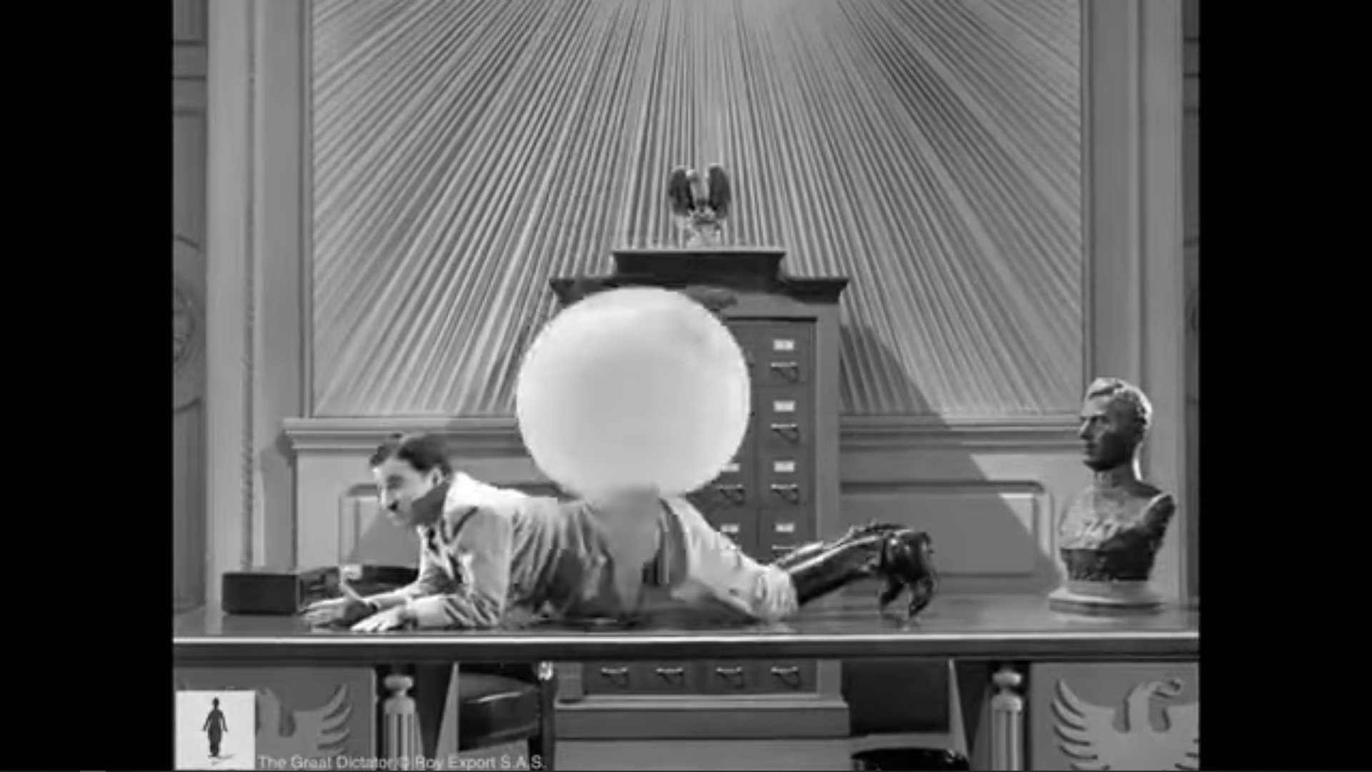 Lorsqu’il ne profite pas de ses tête-à-tête amoureux avec le globe en rotation, le corps désarticulé de Chaplin se livre à une sorte de Kama Sutra improbable : sur pied, sur la table, à l’endroit, à l’envers, pieds, mains, tête … Bientôt , Hynkel se retrouve allongé sur le bureau, à la merci du globe et du temp long de ses rebonds. […] La dernière image du ballon intègre montre d’ailleurs un globe transparent, et un Hynkel aux limites de l’orgasme, juste avant l’explosion finale (Monsaingeon 2025, p. 16).