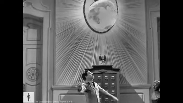 La danse avec le globe commence par la glissade de Hynkel le long des rideaux suivi de son approche du globe. Il répète d’abord deux phrases soufflées juste avant par Garbitsch : « Aut Caesar aut nullus ! (César ou rien) » et « Empereur du monde ! » puis murmure « Mon monde … ». Hynkel prend alors le globe entre ses mains pour le soulever, mais c’est un ballon léger et luminescent qui s’envole et se pose en équilibre sur sa main comme par magie. Hynkel le fait tourner au bout de son doigt puis éclate d’un rire diabolique. Il lance en l’air le globe, le fait rebondir avec les pieds puis la tête, le renverse entre ses bras, et continue à jongler avec lui tout en se dirigeant vers le bureau. Il s’y couche sur le dos, puis sur le ventre, et fait rebondir le ballon sur ses fesses. Tout en jonglant, il saute sur le meuble et de nouveau sur le sol. Au moment où, au bord de l’extase, il semble étreindre le globe, celui-ci éclate. La musique s’arrête, remplacé par de brefs accords de cuivres. Hynkel contemple alors l’enveloppe déchirée du ballon, puis tourne le dos au spectateur et se renverse sur le bureau en sanglotant. ↩︎ - Il ne s’appuie pas sur le thème de l’opéra mais sur un texte de Baudelaire qui décrit l’extase lumineuse, la sensation d’envol et de plénitude qu’il a ressenties à l’écoute du prélude de Wagner. ↩︎