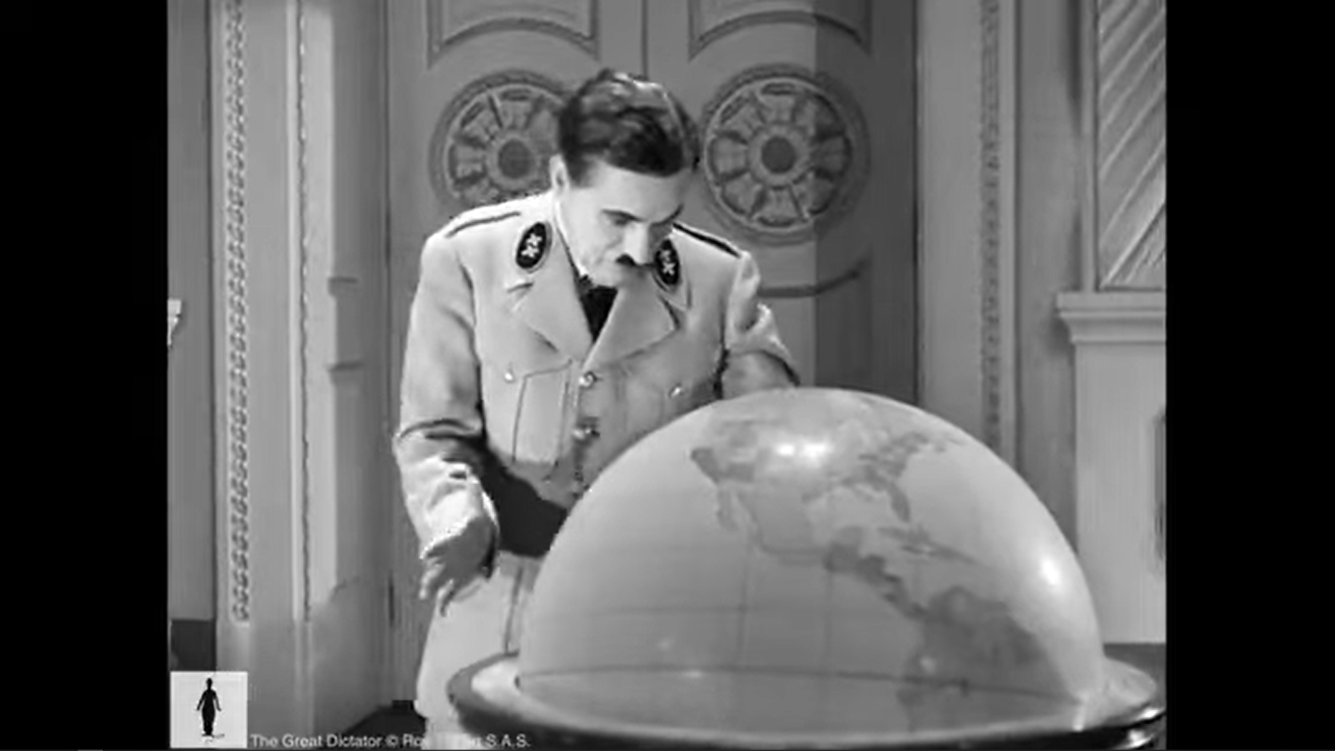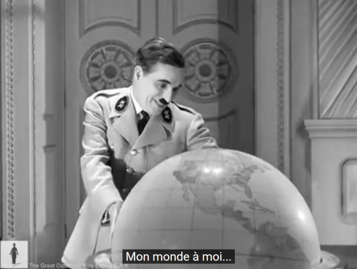 S’il avait vraiment voulu une scène « opposée à la rhétorique du pouvoir », Chaplin aurait opté pour une thématique neutre, par exemple un globe physique habillé de bleu pour les océans, jaune pour les plaines, vert pour les forêts et brun ou blanc pour les montagnes, tout cela rendu en dégradés de gris. Choisir de montrer ce qu’on s’appelle justement une carte politique du monde en dessinant les frontières des pays sur un globe qui va exploser n’est donc pas anodin. Rappelons que Chaplin prépare et tourne cette scène en décembre 1939, alors que l’Allemagne nazie a déjà pulvérisé les frontières de l’Europe, absorbé l’Autriche, rattaché les territoires des Sudètes, annexé la moitié de la Tchécoslovaquie et envahi la Pologne. Il opte donc bien délibérément dans cette séquence pour une « iconographie du pouvoir » qui soit assez discrète pour se fondre dans l’ambiance onirique de la scène sans cacher sa nature géopolitique.