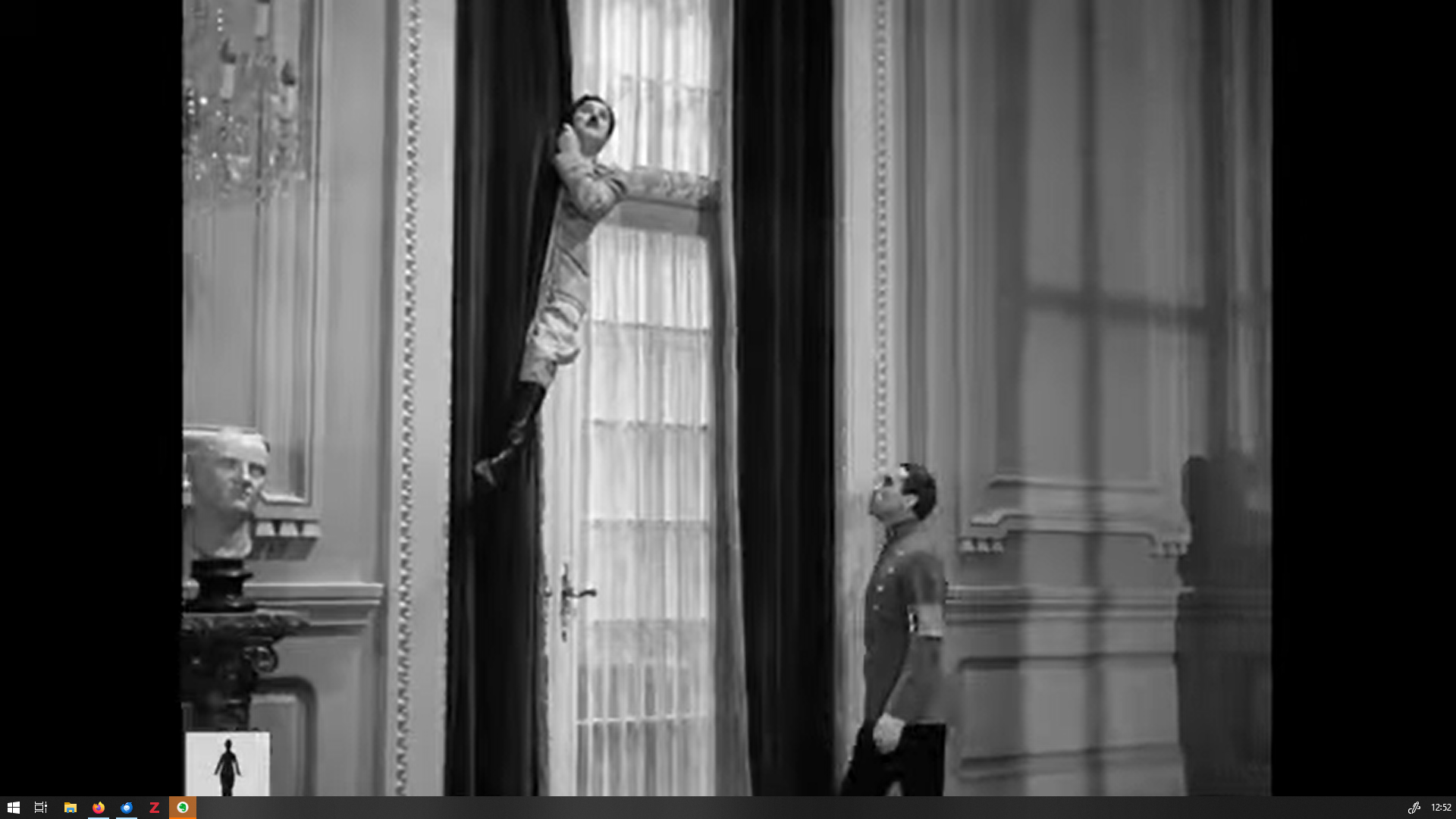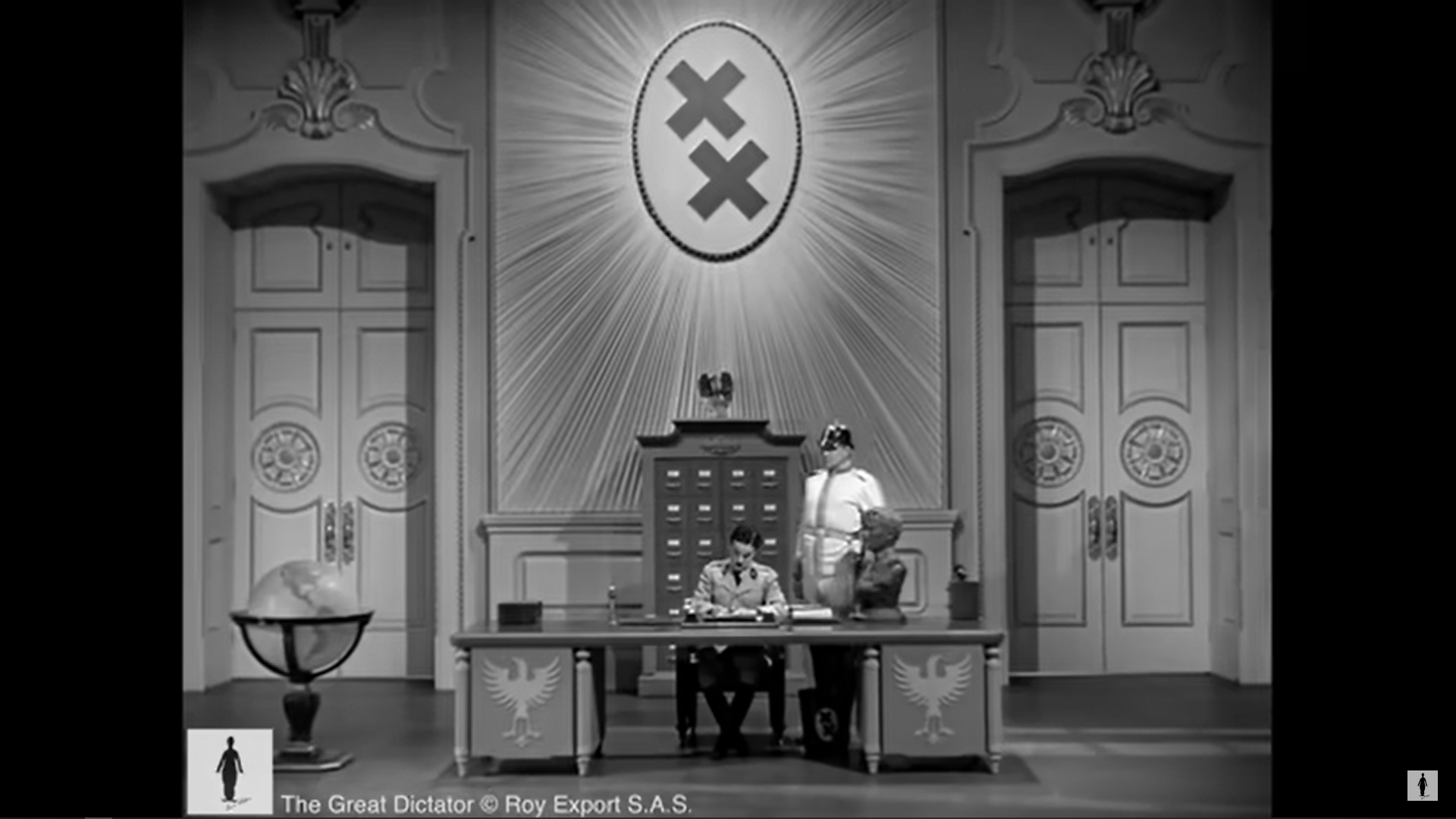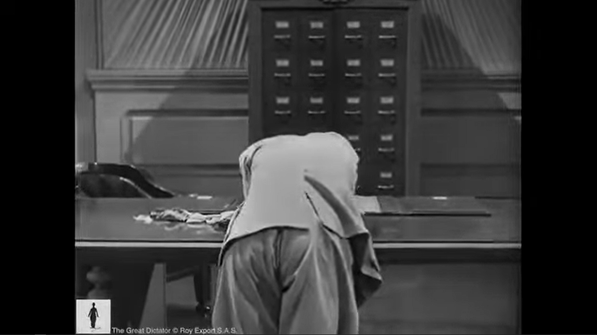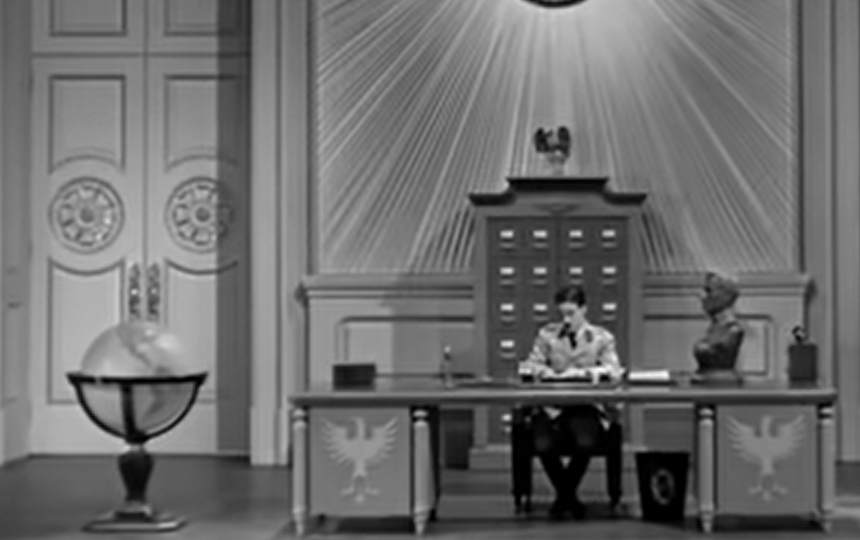Quand Garbitsch évoque son caractère divin, Hynkel grimpe aux rideaux et il domine soudain l’objet décoratif posé à côté de son bureau, qui semble changer de nature. La dimension religieuse ou spirituelle de la scène est confirmée par la réaction paniquée de Hynkel quand Garbitsch le compare à Dieu, comme s’il proférait un blasphème.