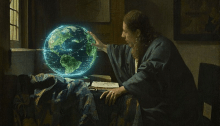 L’image détournant un tableau de Vermeer proposée par Maxime Blondeau symbolise une nouvelle approche cosmographique, à la fois géographique, imagée, fictionnelle et numérique pour répondre aux défis environnementaux et sociaux à l’échelle globale, territoriale et locale. /\ Maxime Blondeau’s reimagining of a Vermeer painting symbolizes a new cosmographic perspective -geographical, visual, fictional, and computational – for responding to environmental and social challenges at the global, regional, and local levels.